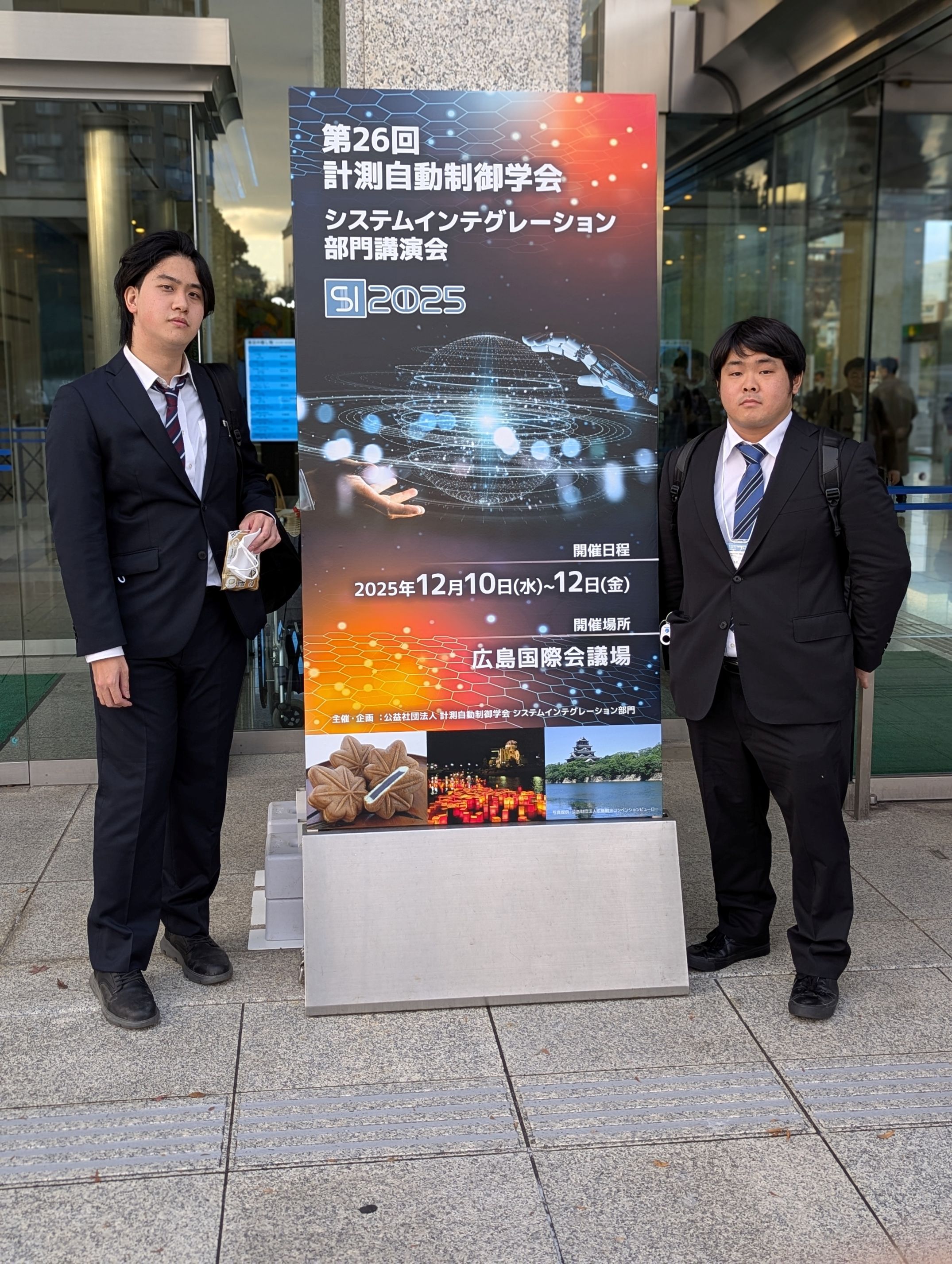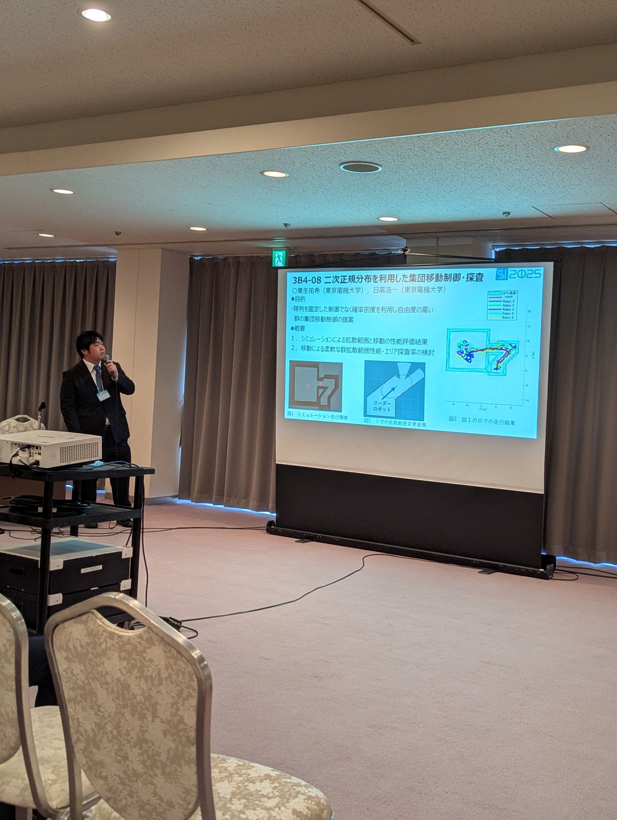 第26回SICEシステムインテグレーション部門講演会(SI2025)(広島国際会議場) 二次正規分布を利用した集団移動制御・探査 栗生 祐希,日高 浩一 ,pp.3785-3789. 遠近地図データ同時観測での尤度変更と改良リサンプリングによるPF自己位置推定精度改善の検討 山口 慶純,日高 浩一,pp.4544-4547. 第26回SI2025でM2栗生君と山口君が研究発表を行いました.