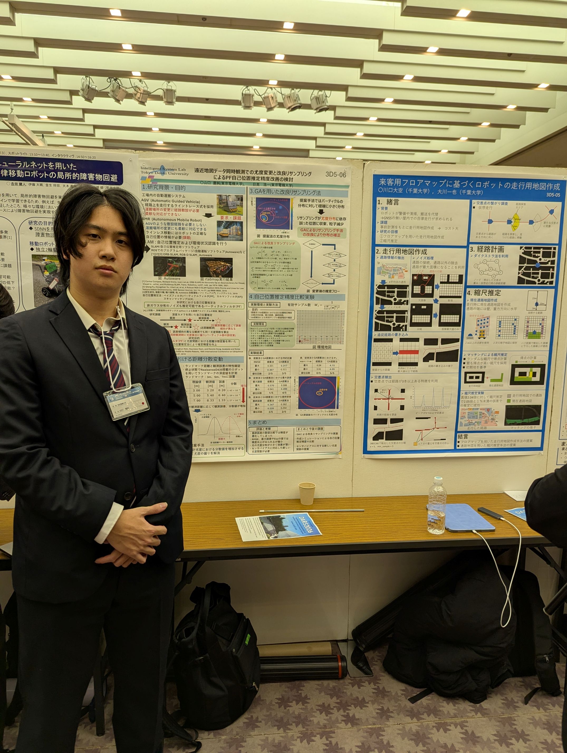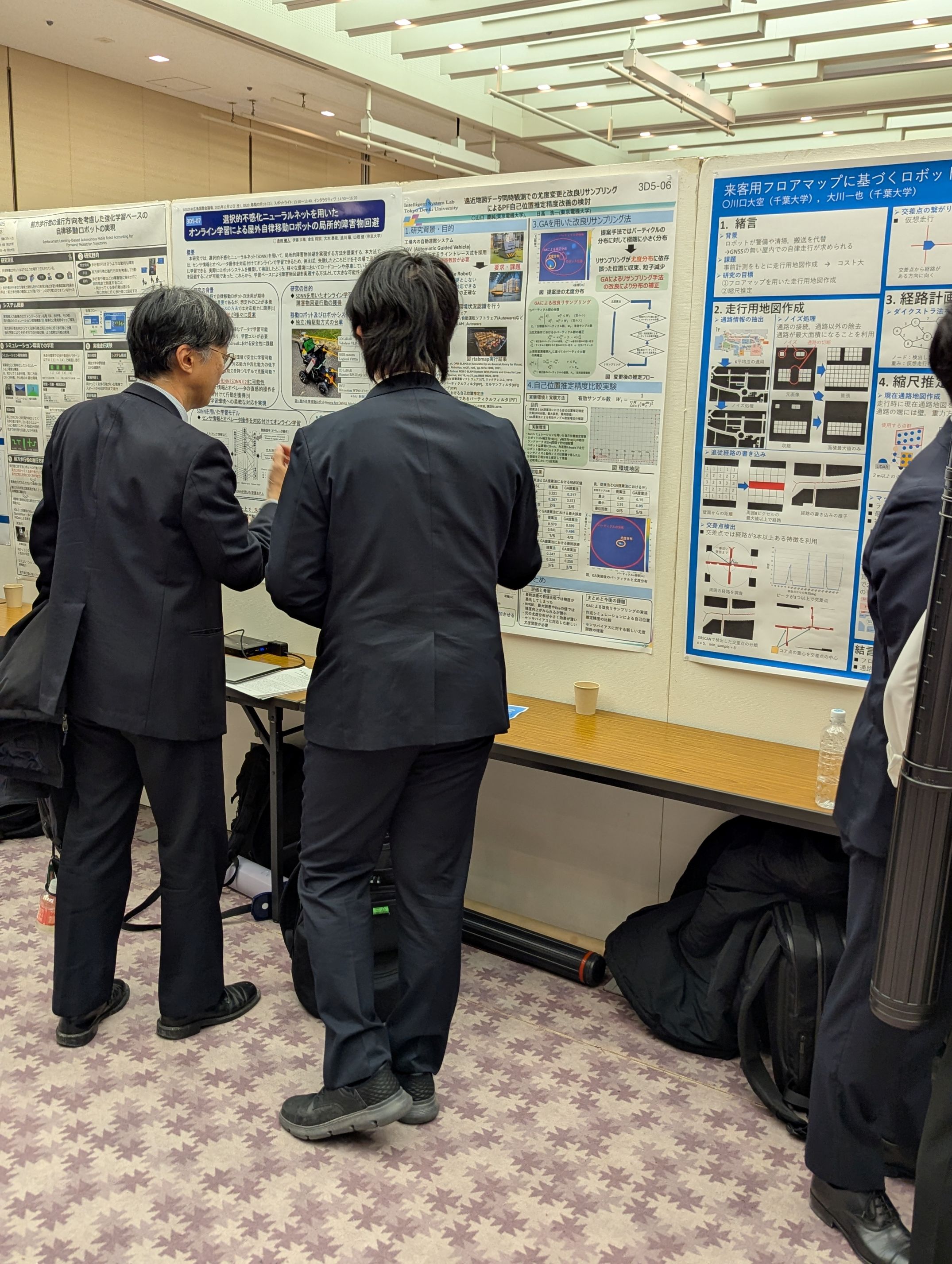 東京科学大学 大岡山キャンパス 橋本鵬弘, 日高浩一 室内環境における建築物構造特徴線を利用した自己位置推定精度向上法の検討 第43回日本ロボット学会学術講演会,2ページ, 2025. ロボット学会、自己位置推定のセッションで橋本君が上記のタイトルで発表を行いました。参加者から提案する構造線を利用する Structure SLAMは多くの論文が発表されているので、関連文献を調べることが重要であるとのコメントや、構造線の位置を中心点にする理由および 縦線のみを利用する理由などの質問がありました。発表に関しては時間内で行うことができ、落ち着いてできたと思います。 研究テーマや内容に関しては、新規性や有用性を主張するためにも、コメントいただいたように関連論文を調べなおして、研究の 立ち位置を明確にしながら進めていくための参考にしてくれればと思っています。 今回の参加者の延べ人数は1600人であることが、懇親会で発表がありました。また懇親会会場は目黒の雅叙園で行われました。 今まで参加してきた懇親会会場の中でもゴージャスな会場であり、会場内の写真撮影をしている参加者が多くいました。